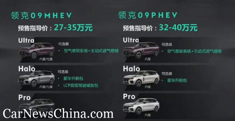 Sold with either mild-hybrid or plug-in hybrid powertrains, the 09 is available in three trim levels each- Pro, Halo, and Ultra. MHEVs come in 6 or 7 seat configurations, while PHEVs come in 6 seats only. The powertrain consists of a 2.0T engine and an Aisin 8 speed automatic transmission regardless of the powertrain; the mild hybrid recuperates braking energy only, while the plug-in hybrid can act as a pure EV on short journeys.