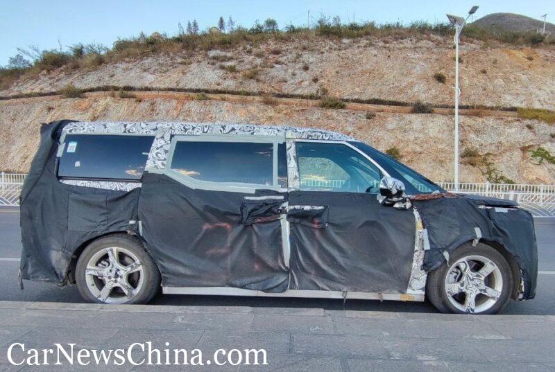 The vehicle is heavily camouflaged but we can tell quite a lot: it is huge, with three rows and six or seven seats. It has a very short front overhang, in typical MPV style. The windshield moved far forwards from the A pillar. There is a sliding door and the rear is very short and straight.