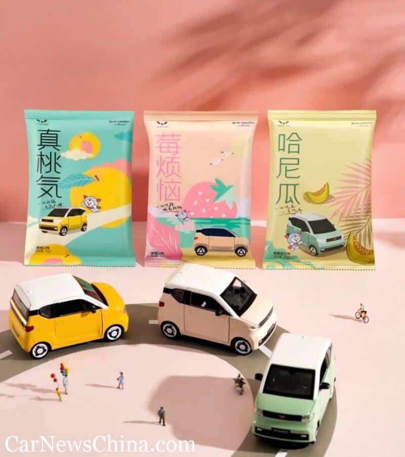 A PR image released by Wuling with the ice cream packages, 3 Macaron dealer models in scale 1:43, and some Photo-shopped folks.