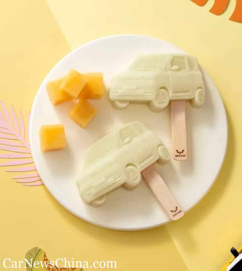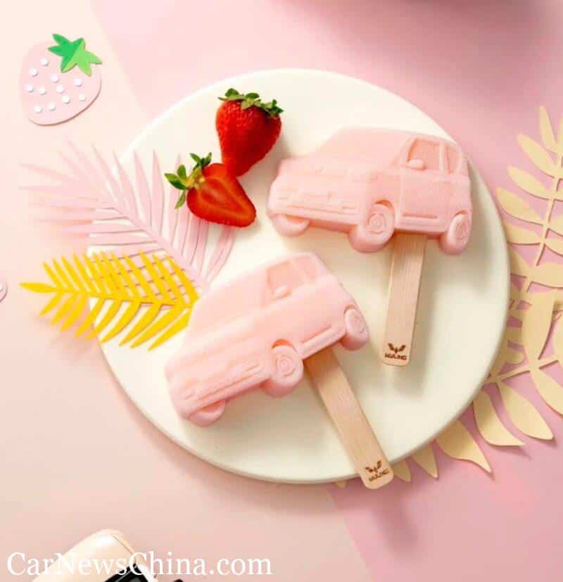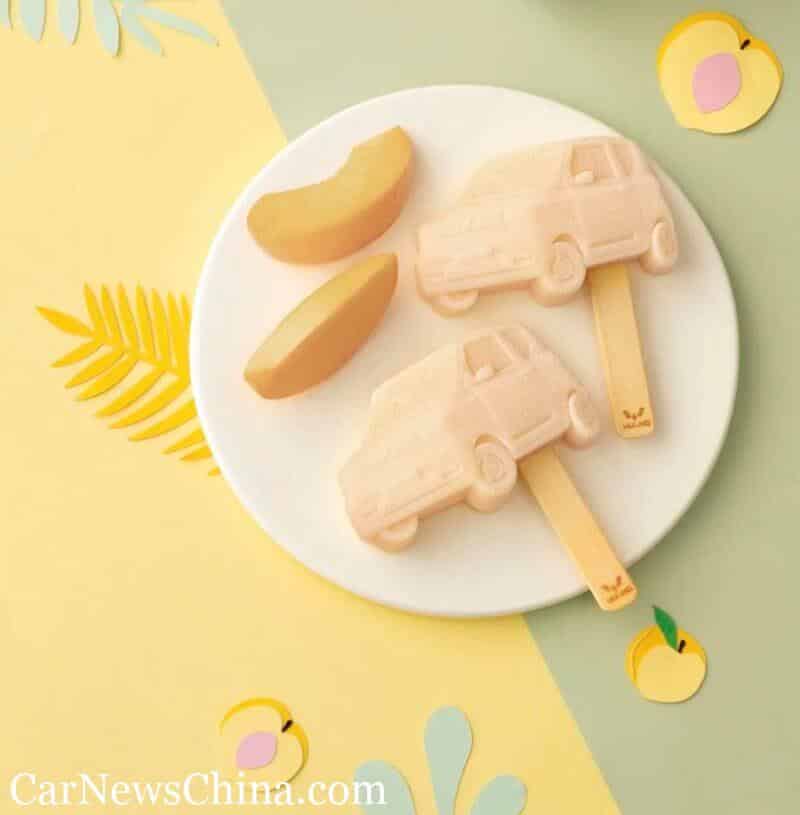 The ice cream will soon become available at Wuling dealers across China. In the north after the winter ends, we guess. The ice cream is cross-marketed with the MINI EV Macaron model. There are three flavors: Strawberry, Peach, and Honey Lemon. The ice creams come with 10 in a box. Each ice cream is packed in a funky package with an image of the MINI EV Macaron on it. The 65 gram ice cream is shaped like a MINI EV.