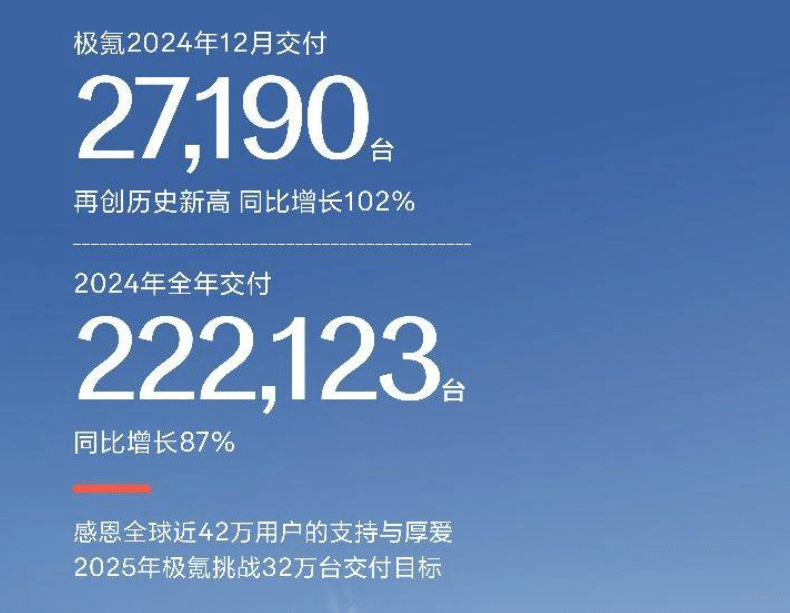 In December 2024, Zeekr delivered 27,190 vehicles, a year-on-year increase of 102%, bringing its 2024 annual delivery to 222,123 vehicles, a year-on-year increase of 87%. Then on January 2, An Conghui, President of Geely and CEO of Zeekr, indicated that Zeekr’s sales goal for 2025 will increase by 100,000 units, targeting an annual sales of 320,000 vehicles.