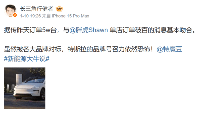 长三角行健者 is a Weibo-certified auto blogger with 121,000 followers. On December 31, 2024, he shared online that the new Tesla Model Y is expected to be launched in January 2025, with a direct source from a Tesla salesperson.