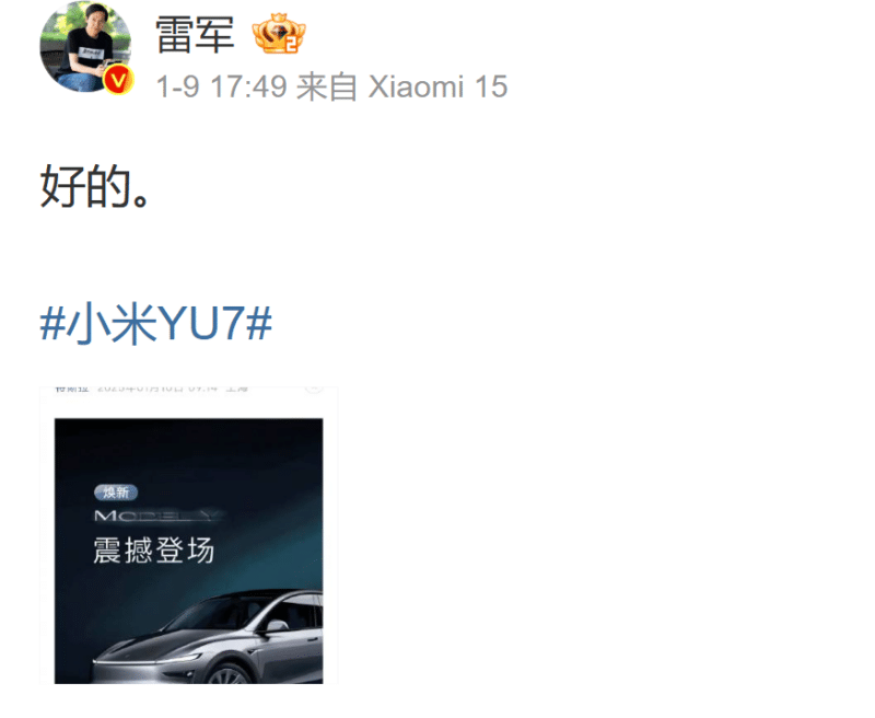Furthermore, on Weibo, the phrase “New Model Y, despite the comparison” quickly topped the hot search list after the new model was released. Lei Jun, the founder of Xiaomi, also responded to this on Weibo with an “OK” and tagged the Xiaomi YU7.