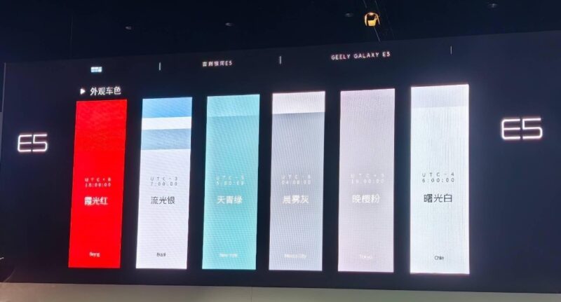Six exterior paints are available for consumers to choose from: red, silver, green, gray, pink, and white. The Geely Galaxy E5 measures 4615/1901/1670 mm with a 2750 mm wheelbase. The curb weight ranges from 1615 kg to 1740 kg. Its official coefficient is 0.269Cd.