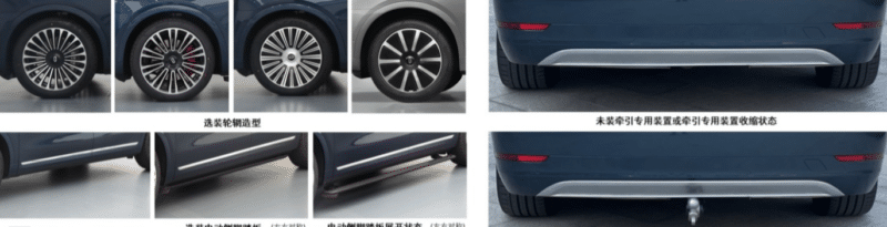 The new Aito M9 is 5230/1999/1800 mm in length, width, and height, and has a wheelbase of 3110 mm. The approach and departure angles are 18° and 20°, respectively. The tire specifications are 265/45R21, 285/45R21, 265/40R22, and 285/40R22.