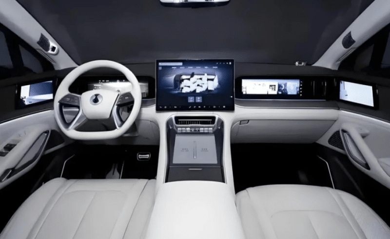 The cockpit features a three-screen display consisting of a 17.3-inch central control screen, a 13.2-inch full LCD instrument, and a 13.2-inch co-pilot entertainment screen, powered by a 4nm cockpit chip. There is also a 50-inch AR-HUD and a streaming screen for each of the side mirrors. A small number of physical buttons are retained on the center console along with two wireless charging pads for mobile phones. The traditional armrest box space has become a car refrigerator.