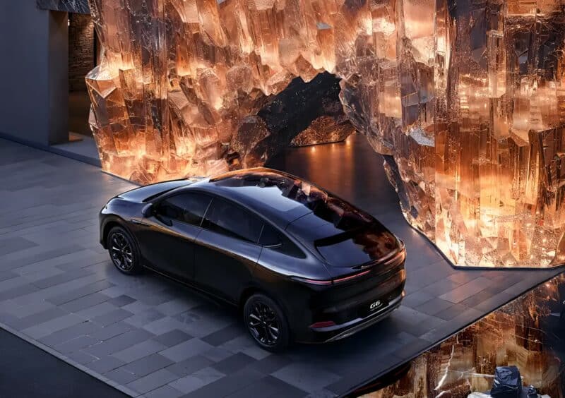 Inside, the G6 has a larger infotainment screen than the current model, with both the instrument cluster and central display using a floating design. The interior layout resembles Xpeng’s P7+ liftback (see specs), featuring a central charging pad and additional storage space. The doors now use electronic buttons for operation.