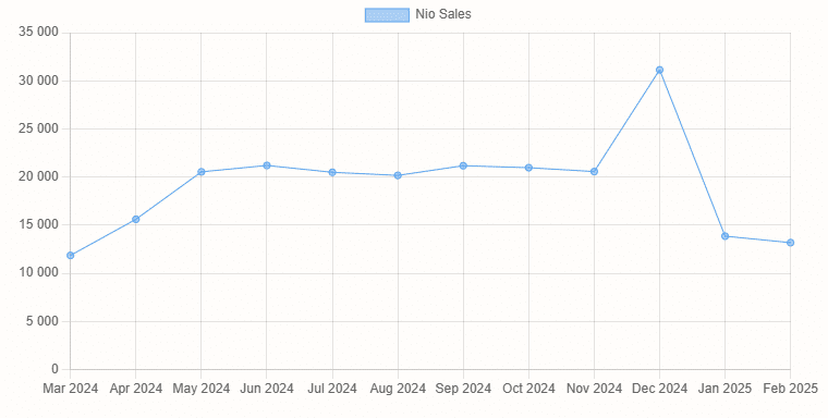 Company sold 17,094 Nio branded vehicles in Jan+Feb 2025, down 6% from 18,187 in Jan+Feb 2024.