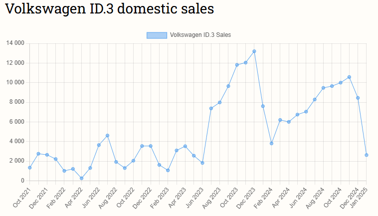 SAIC-VW makes ID.3, which is Volkswagen’s best-selling EV in China. In January, the company sold 2,623 units, down 65.5% year-over-year. In 2024, the company sold 93,816 units of ID.3 in China.