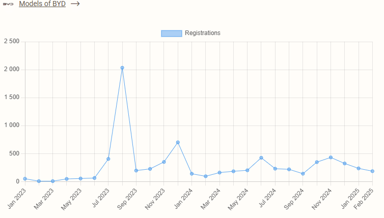 BYD registered 185 vehicles, down 21.3% from 235 units in January and up 97% from 94 cars in the same month last year. In 2024, BYD sold 2,891 vehicles in Germany.