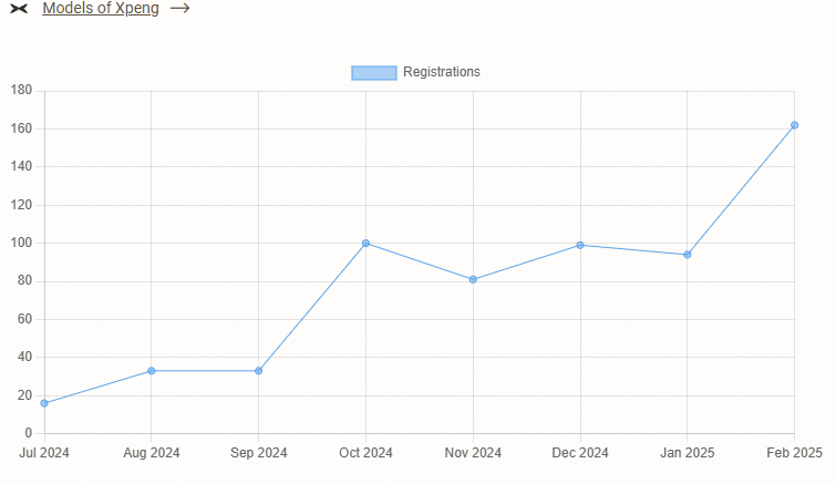 Xpeng registered 162 vehicles, up 72.3% from 94 units in January. A YoY comparison is unavailable as Xpeng entered Germany in March 2024, with deliveries starting in the second half of the year.