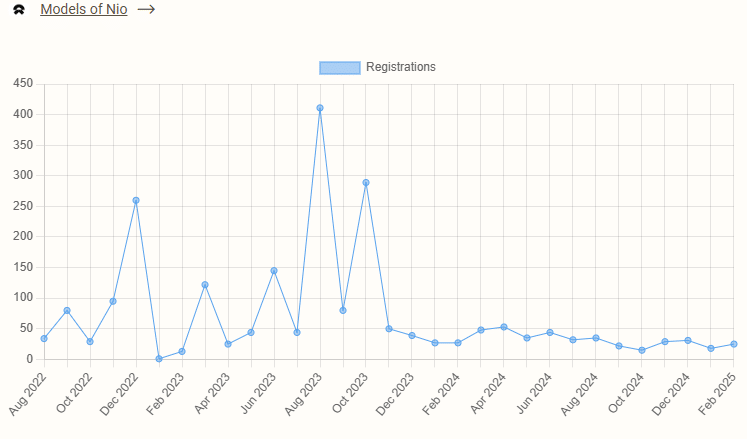 Nio registered 25 vehicles, up 38.9% from 18 units in January and down 7% from 27 vehicles in the same month last year. In 2024, Nio sold 398 vehicles in Germany.