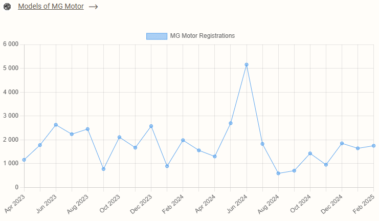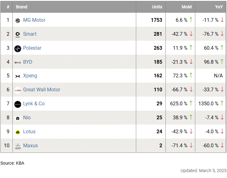 SAIC-owned MG got the first spot with 1,753 registered vehicles, up 6.6% from 1,645 units in January and down 12% from 1,986 vehicles in the same month last year. In 2024, MG sold 20,977 cars in Germany.