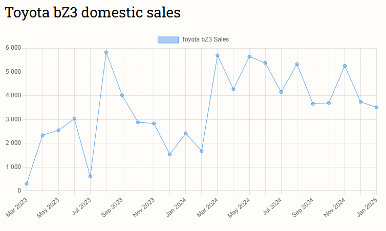 Toyota already has two all-electric bZ series cars in China: the bZ4X SUV and the bZ3 sedan, which was developed together with BYD and featured BYD electric motors and battery. While bZ4X has ceased deliveries in China already, bZ3 sales are surprisingly not as bad as you would expect. In January, the company sold 3510 units, up 45% year-on-year.