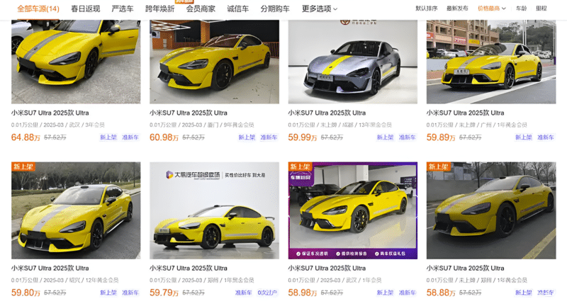 “Second-hand” Xiaomi SU7 Ultra vehicles are already being resold at inflated prices just one week after the car’s official launch. Listings on Autohome’s second-hand market platform show dealers in cities like Wuhan, Shenzhen, and Guangzhou offering the SU7 Ultra for 548,900 to 648,800 yuan (75,700 to 89,500 USD) — well above the official retail price of 529,900 yuan (73,100 USD). Experts believe many listings are from scalpers cashing in on the car’s soaring demand.