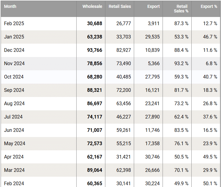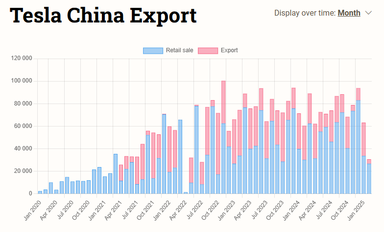While Tesla’s export and retail sales were down 87% and 11.2% YoY, respectively, a year-on-year comparison with February 2024 is not ideal due to the shifting dates of the Chinese New Year (CNY) holiday. A more correct comparison would be to take the year’s first two months (January+February) with the same period in 2024. More details are explained here.