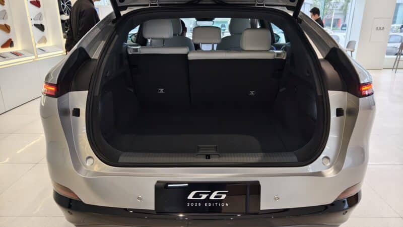 The interior also boasts a 9-inch streaming rearview mirror, soft-touch materials in the wireless fast-charging area, and “cloud-sense” seats that offer heating, ventilation, and massage functions for the front seats. The 2025 G6 claims to have the most significant interior space and armrest box volume in its class, with an 8.9 L capacity to hold five 600 ml water bottles. The trunk offers 647 L of standard storage, expandable to 1,752 L.