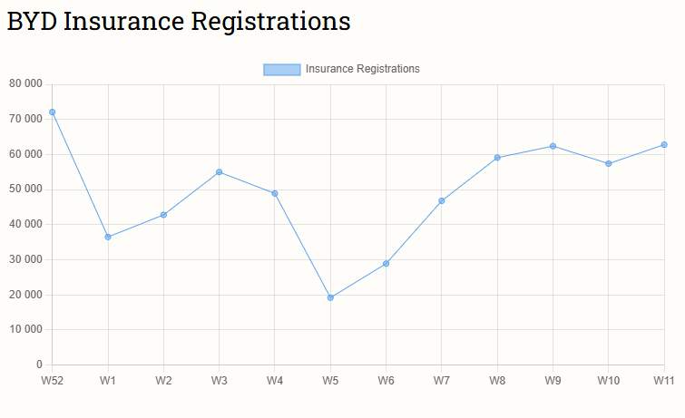 BYD secured the top position with 62,800 insurance registrations in China, up 9.4% from 57,400 units the week before. In the first two weeks of March, BYD registered 120,200 vehicles in China.