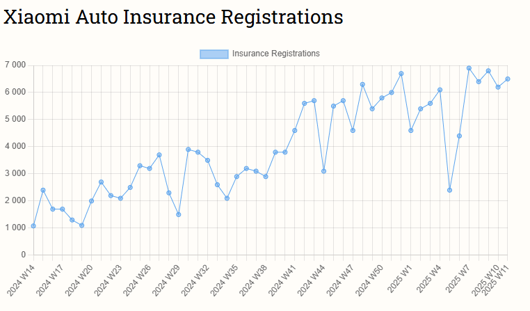 Xiaomi registered 6,500 units, up 4.8% from 6,200 units the previous week. In the first two weeks of March, Xiaomi registered 12,700 vehicles in China.