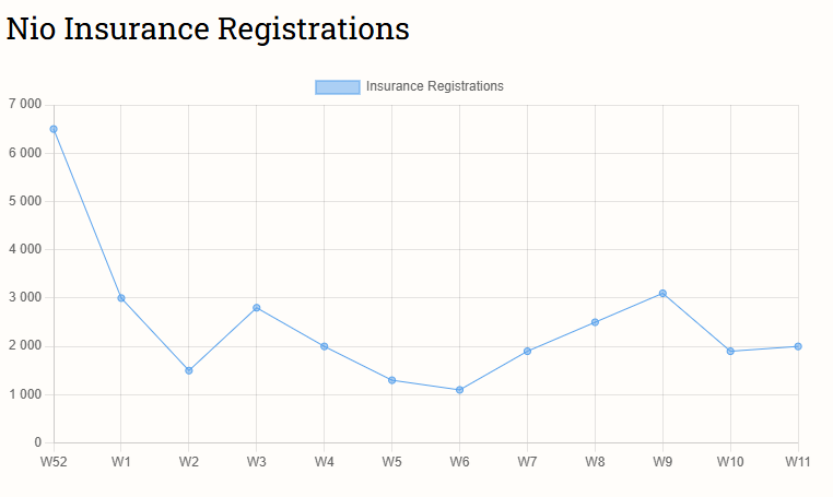 Nio posted 2,000 registrations, increasing 5.3% from 1,900 units the week before. In the first two weeks of March, Nio registered 3,900 vehicles in China.
