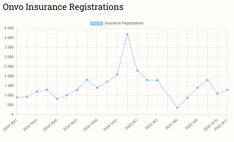 Onvo recorded 1,300 registrations, up 18.2% from 1,100 units a week earlier. In the first two weeks of March, Onvo registered 2,400 vehicles in China.