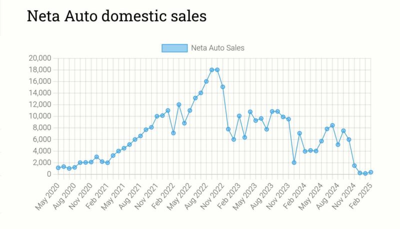 From a sales perspective, Neta has been in trouble this year. According to China EV DataTracker, its January sales decreased by 98% year-on-year, and in February, it sold fewer than 400 cars.
